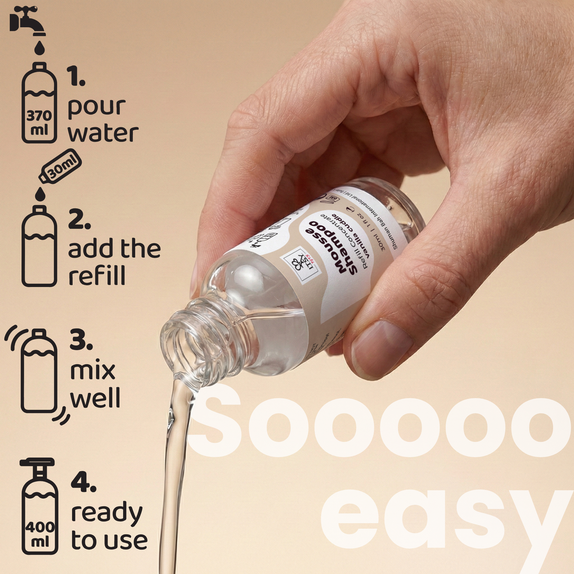 Smart Savings, Sustainable Care Each box contains one 30ml concentrate refill. Simply mix the 30ml bottle with 370ml of water in your reusable foaming pump to create 400ml of ready-to-use mousse shampoo. That means this single recyclable box gives you a full 400ml bottle of premium pet wash! Remember to use the solution within 6 months after mixing for optimal freshness.