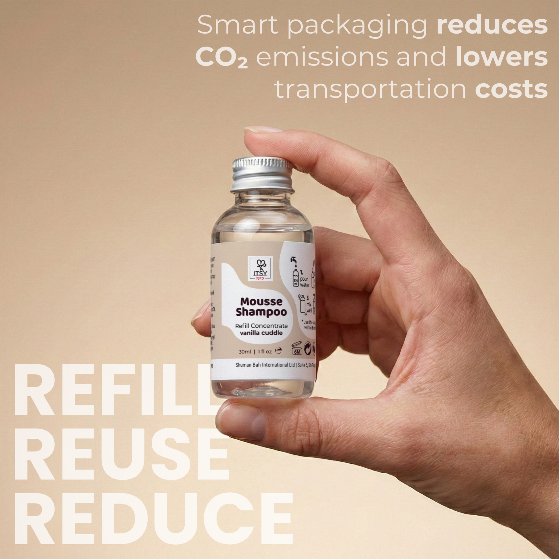 Continue making bath time faster, easier, and kinder to the planet with the ITSY Pets Mousse Shampoo Refill Concentrate. Designed to replenish your existing starter pack, this eco-friendly concentrate targets the global single-use plastic problem head-on by letting you reuse your existing mixing bottle.